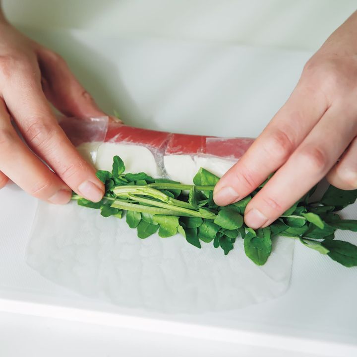 2:ライスペーパーは袋の表示どおり濡らして、モ ッツァレラチーズ、まぐろ、クレソンの茎を中央よりやや下に並べて手前からひと巻きし、左右を 折りたたみ、クレソンの葉をのせてさらに巻く。