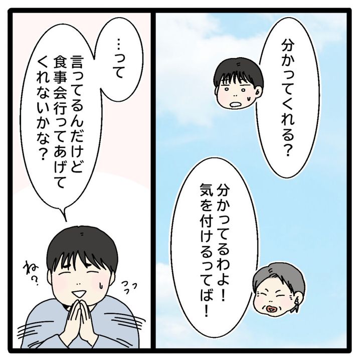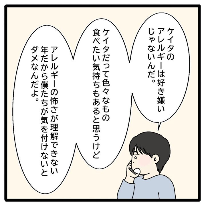 息子のケイタに会いたいから一緒に食事をしようと提案してきた義母。アレルギーのことで責められた私を気遣い、夫タツヤは何度も説明しているアレルギーのことを、あらためて義母に伝えてくれました。「ケイタのアレルギーは好き嫌いじゃないんだ。ケイタだって色々なもの食べたい気持ちもあると思うけど、アレルギーの怖さが理解できない年だから、僕たちが気を付けないとダメなんだよ」