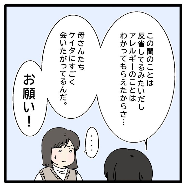 両手を合わせて頼み込む夫を前に、「この前のことは許せないし、本当は会いたくないけど・・」と心の中で呟きながら考え込んでいました。今までの行動から考えて、ケイタのアレルギーを本当に理解したとは思えません。