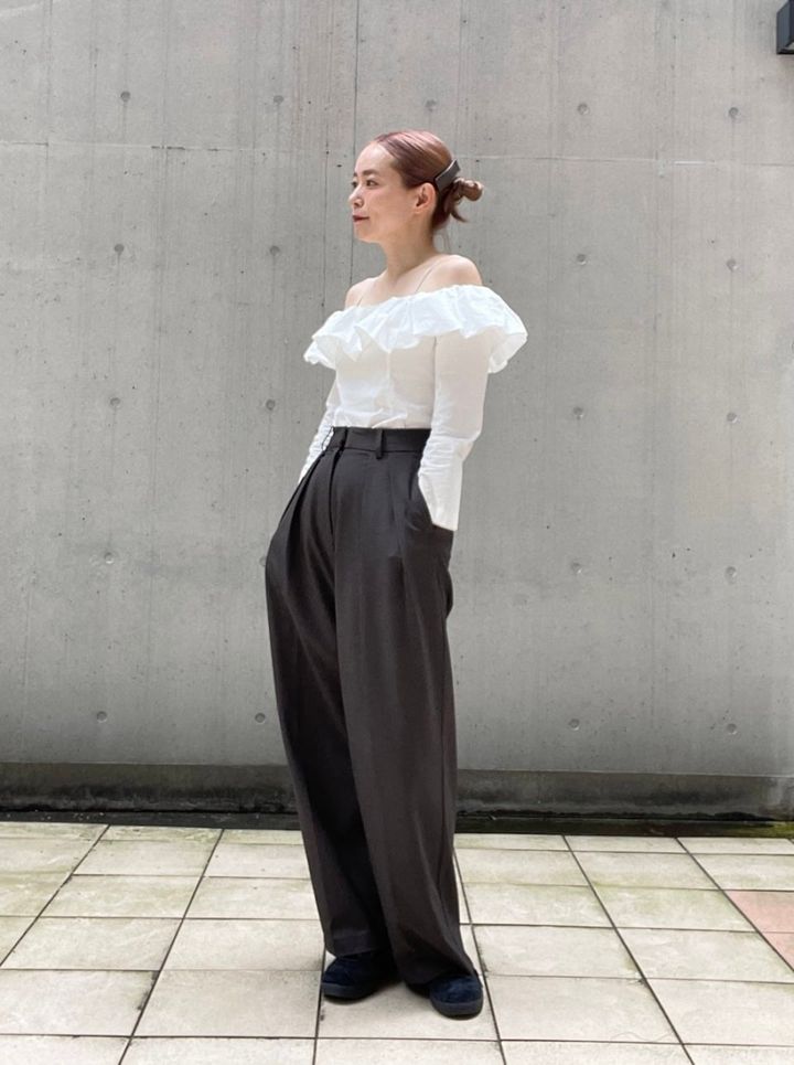 「オフショルダーで甘めなガジェスのブラウスは、大人の装いにフィットするタイトなシルエットが絶妙。今回はハンサムなボトムに合わせてアクセサリーはせず、髪はタイトに結ぶことでスッキリとまとめました。あえてスニーカーにすることで、足元にボリュームを持たせたこのバランスがとても気分です」