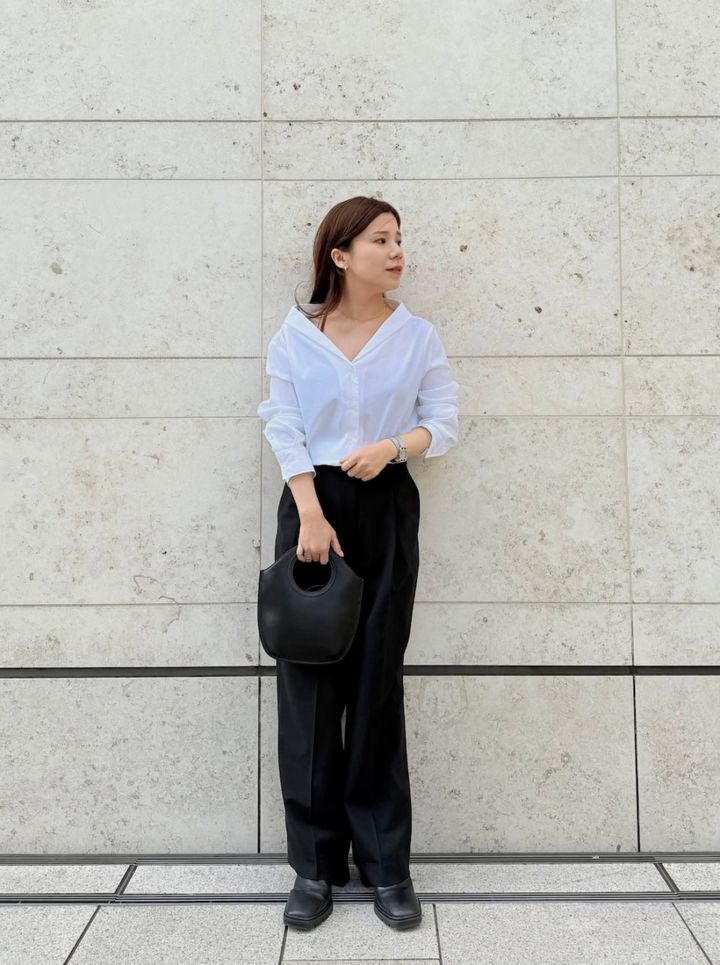 「5月に発売を予定しているセオリーのブラウス。ほどよいあきが印象的な、オフショルダーシルエットのネックラインが特徴です。ホワイトブラウス×黒のタックワイドパンツというベーシックなスタイリングも、デザイン性のあるシャツにすることでトレンド感とヌケをプラスしてくれます」