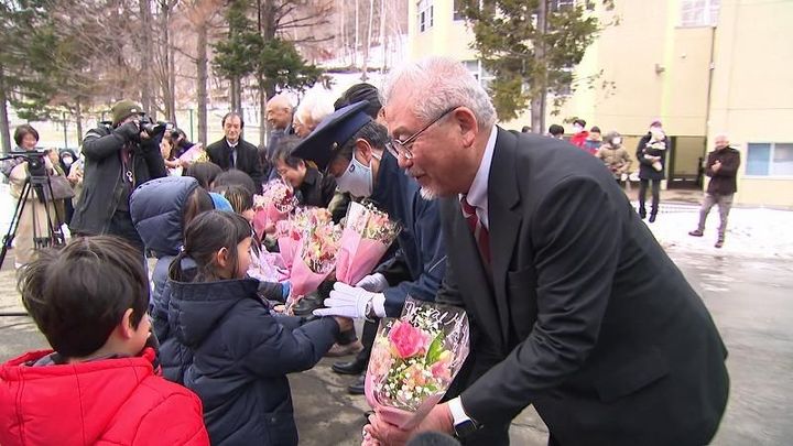 朝の駒岡小学校では、児童と地元の人たちが集まり、バス路線の継続を記念するセレモニーが開かれました。
