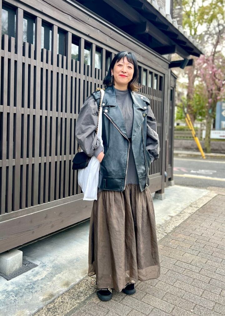 エアリーな素材の「リッシュデコ」のセットアップは、パフスリーブやたっぷりのギャザー使いで甘さもたっぷり……かと思いきや、袖なしライダースやメタルなサンダルといった辛口アイテムをミックスしたHatさん。「リッシュデコ」の服は、「すごく便利でおしゃれにしてくれる」と、大のお気に入り。「ビッグシルエットなど、体型カバーできる服は楽ですが、トップスがボリュームのあるものならボトムスはラインが出るもの、またはその逆になるように工夫しています。メリハリを出すことでこなれ感が出るような気がします」。