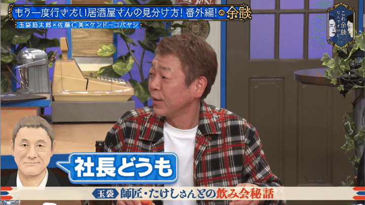 「その時に面白いのに乗っかってくれんだよね。その日は俺たちが社長っていう役柄なんですよ。そうすると師匠が『あ、社長どうも』って言ってくださって」と玉袋が話すと、濱家は「粋ですね」と感心。「で飲みますわね。その姿を見て一番驚いてるのは女将さんだよね。なんでたけしさん、こんな若ぇのに『社長、社長』言ってんだ?みたいな」。