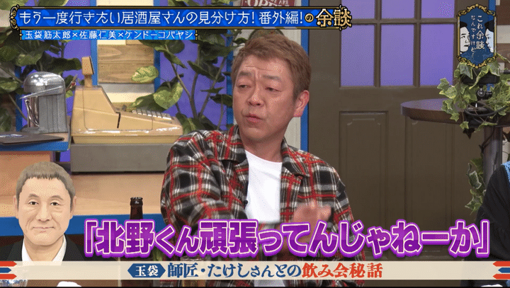 ケンドーコバヤシから「殿と飲みに行かれることは結構あったんですか?」と訊かれ、「昔浅草キッドとして活動していた頃、師匠に恩返ししなきゃいけないという気持ちがあって、水道橋博士と俺で毎年盆暮れの2回接待していた」と話し始めた玉袋。