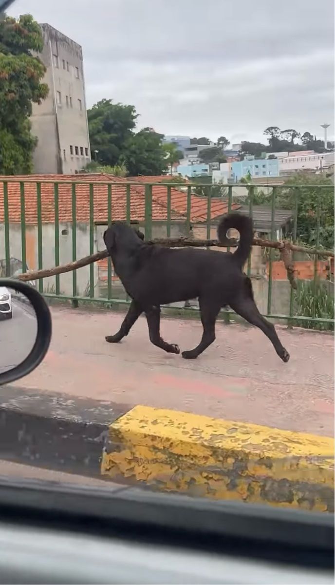 車に乗っていた撮影者さんは、歩道からはみ出すほど長い木の枝をくわえて歩くイヌを目撃しました。 特大サイズのオモチャを手に入れたこの子はご機嫌なようで、その足取りはルンルンと弾んでいるのが後ろ姿からも確認できます。