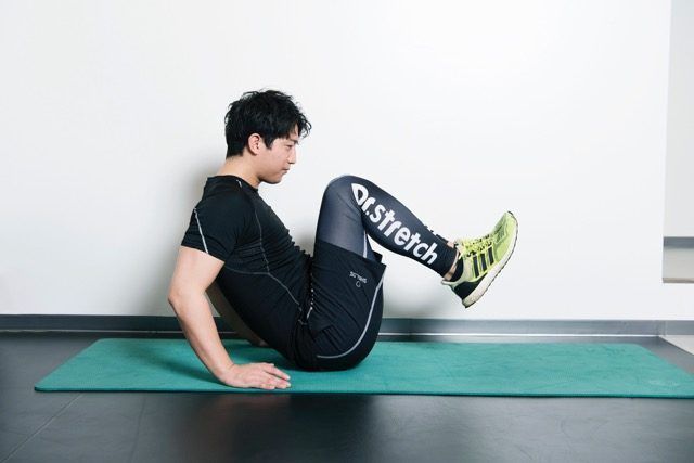 (1)両ひざを立てて座って手を腰の横に置き、重心を後ろに倒して両脚を腹筋に負荷がかかる位置(床から約40度)に上げる