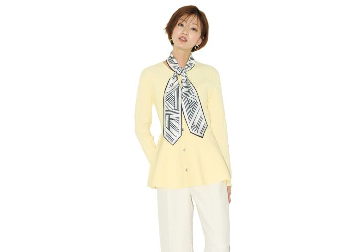 パンツ¥12,100/MERCURY DUO(MERCURY DUO ルミネエスト新宿店) カーディガン¥11,000/PLST スカーフ[ニット付き]¥15,400/SNIDEL ルミネ新宿2店 ピアス¥4,730/mimi33(サンポークリエイト) バッグ¥8,800/カカトゥ(アンビリオン) フラットシューズ¥16,500/クムウ_ダイアナ(ダイアナ 銀座本店)