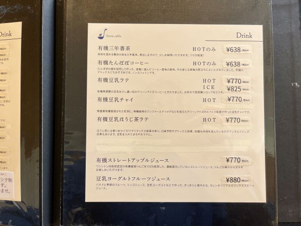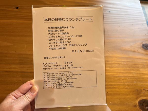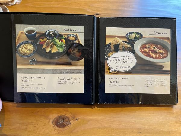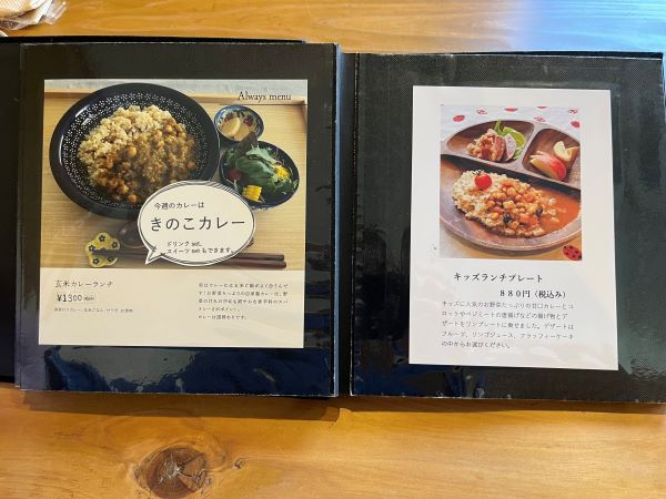 ランチメニューは3種類から選べます。 「日替わり玄米ランチプレート」(1650円)、「具だくさんスープランチ」(1300円)、「玄米カレーランチ」(1300円)。 どれも美味しそうでかなり悩みましたが、日替わり玄米ランチプレートをお願いしました。 お子さん用にキッズランチプレートがあるのもいいですね!