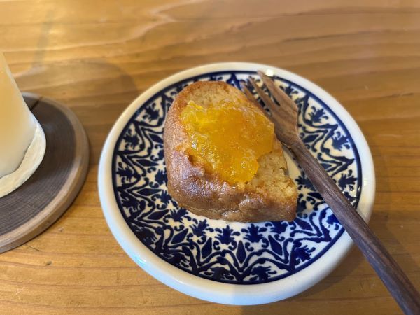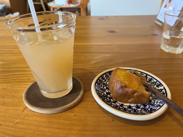 ストレートリンゴジュースと自家製マーマレードのケーキにマーマレードが乗せてあります。ケーキは少し温めていただいていたのでふわっと食べやすく美味しかったです。とっても大大満足なランチでした!