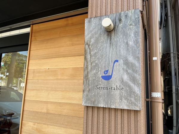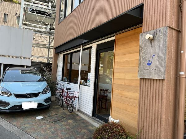 シンプルな看板が目印のSeren-tableさん。お店の雰囲気が伝わってきますね!お店の前には少し空間があるので、自転車や車が1台置けるスペースになります。