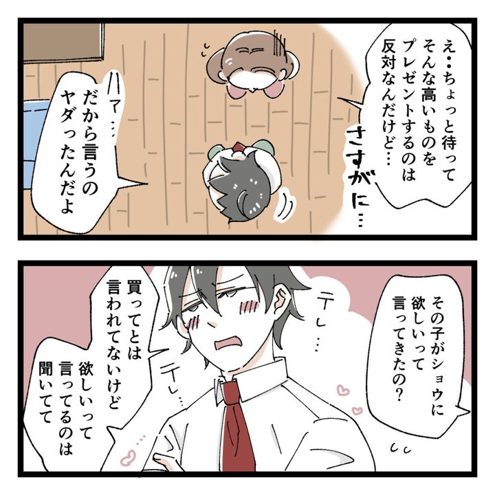 「え・・ちょっと待って。さすがに、そんな高い物をプレゼントするのは反対なんだけど・・」お母さんの言葉に、「ハァ・・だから言うのヤダったんだよ」と呟くショウくん。