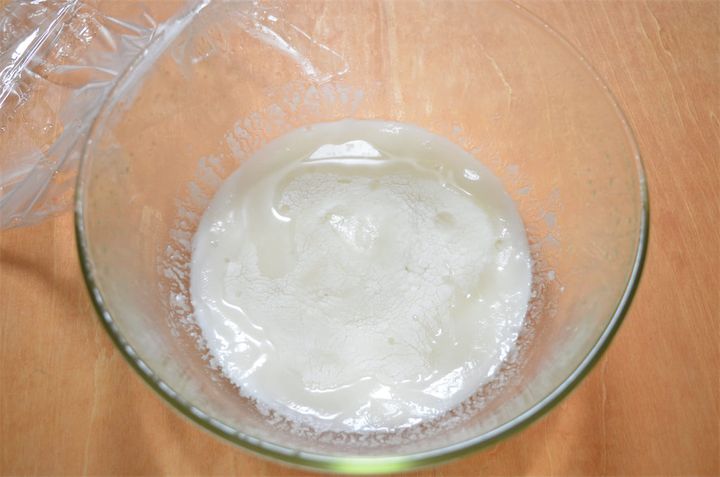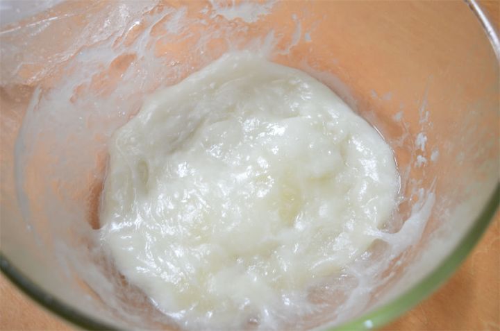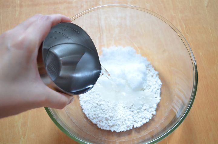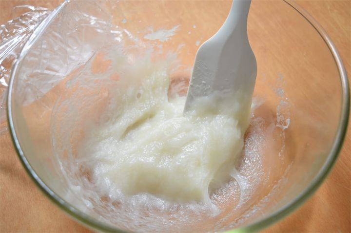 1. 白玉粉、砂糖、水を混ぜ合わせたら、ラップをして600Wのレンジで3分加熱し、シリコンベラで練り混ぜる。さらにもう一度600Wのレンジで3分加熱する。