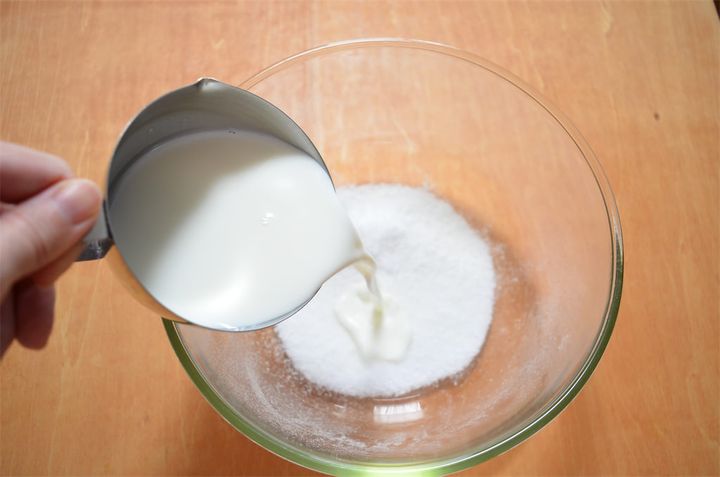 4. 砂糖と小麦粉をふるいにかけて混ぜる。