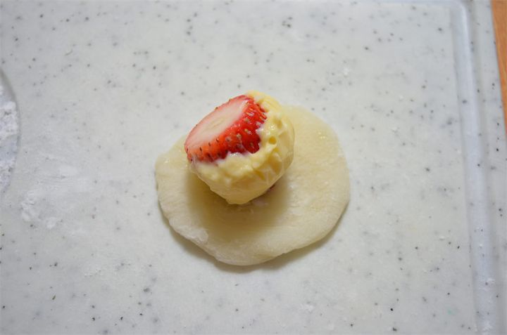 9. 餅を丸く伸ばした上にカスタードを広げて、上にいちごを乗せて包む。