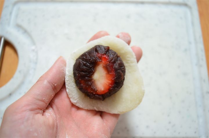 3. いちごのヘタを切って、あんこを3等分に丸めていちごを包み、2の餅を丸く伸ばしてあんこを包む。
