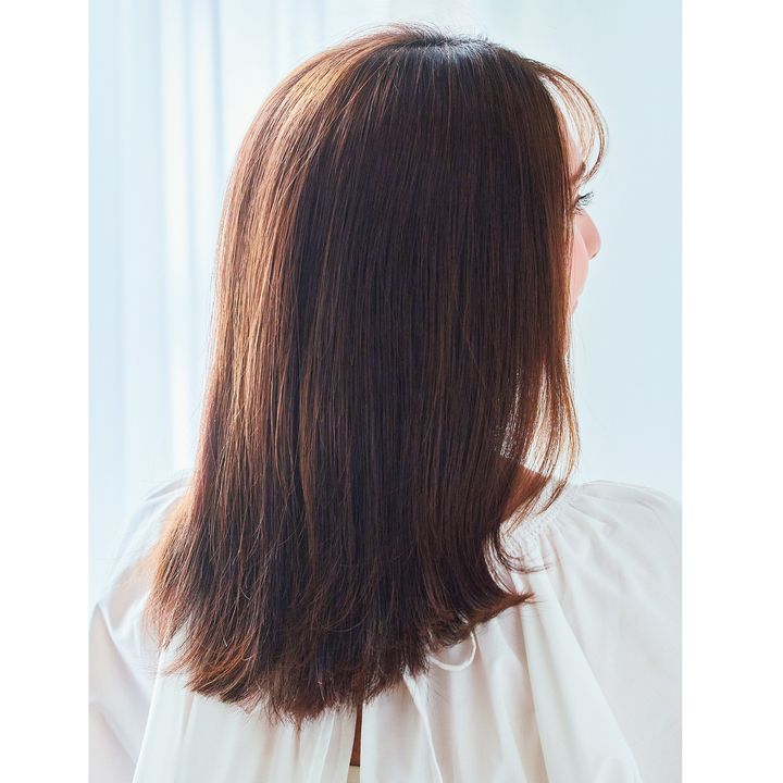 鎖骨下10cmで、アウトラインをやや前上がりにカットし、全体は毛先15cmにレイヤーを。顔周りは高めの位置からレイヤーを入れて、動きと軽さを演出しています。