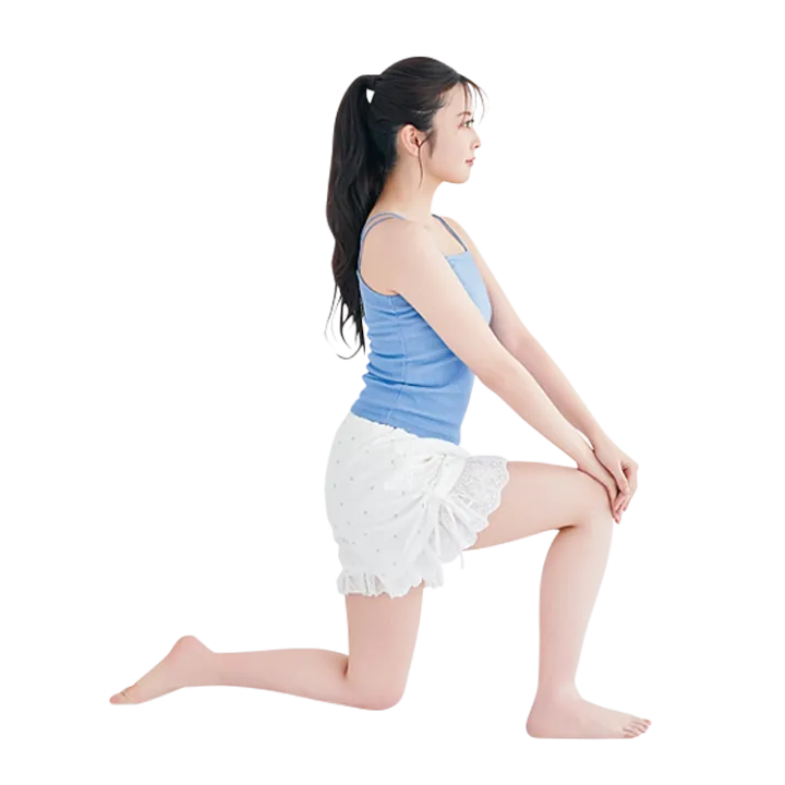 ひざ立ちをしたら、片ひざを立てて背すじをのばす。両手は立てたひざの上に置くよ。