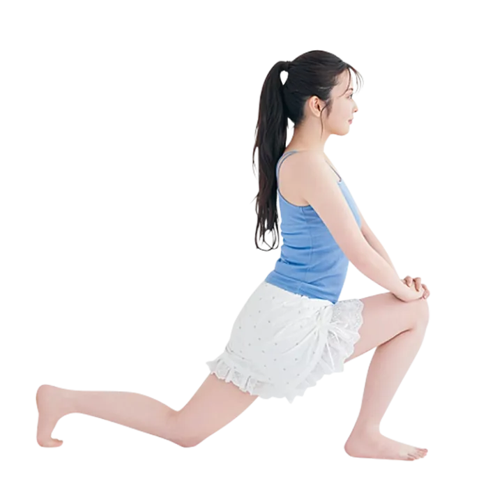 後ろ足のつま先を立て、上体を前に倒す。内ももがのびるところまで倒すのがコツ!