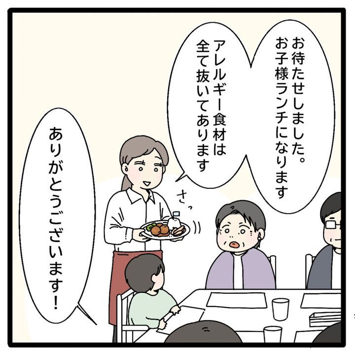 マリさんに酷いことを言ったと反省していると義母から電話があり、考えた末に食事会に行くことにしたマリさんは、事前にレストランに連絡し、アレルギー食材を除いたケイタくん専用のお子様ランチを用意してもらえることになり、安心して当日を迎えました。