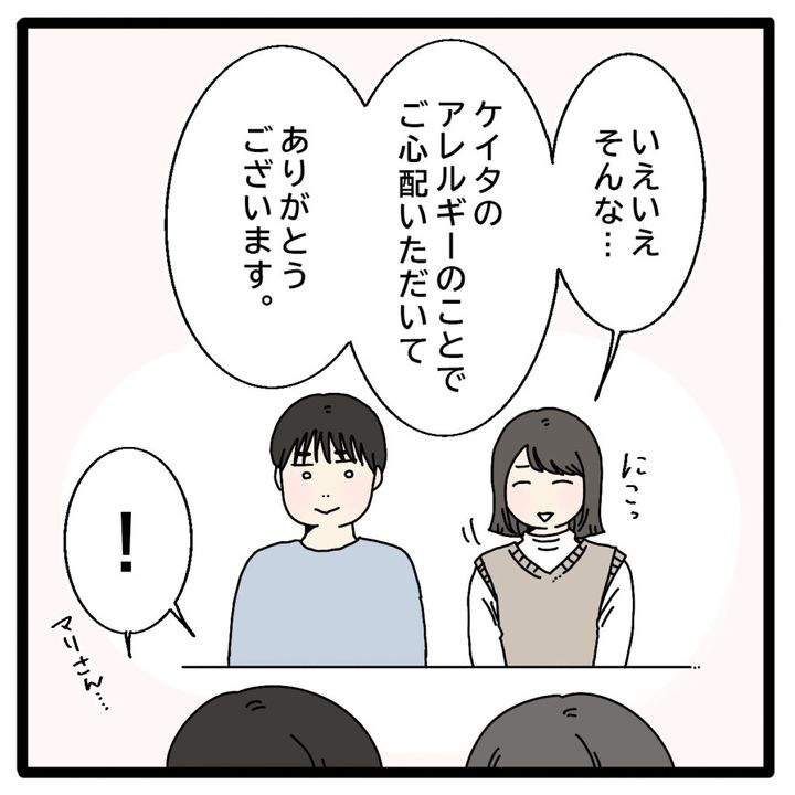 「いえいえ、そんな・・ケイタのアレルギーのことでご心配いただいてありがとうございます」私は笑顔で謝罪を受け入れました。