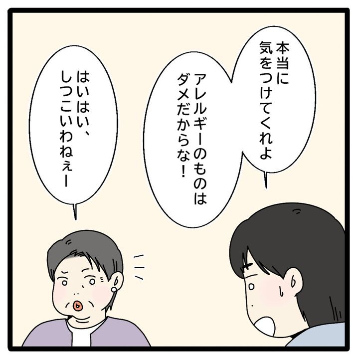 「本当に気をつけてくれよ。アレルギーのものはダメだからな!」それでも念押しする夫に、「はいはい、しつこいわねぇー」と呆れたように義母が言いました。