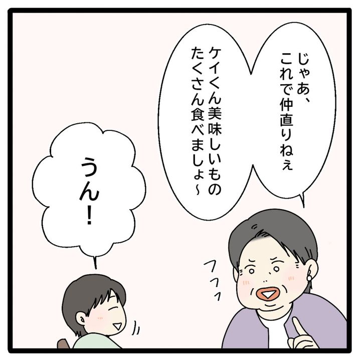 それを見た義母が、「じゃあ、これで仲直りねぇ。ケイくん美味しいものたくさん食べましょ~」笑いながらそう言うと、「うん!」ケイタも笑顔で答えました。