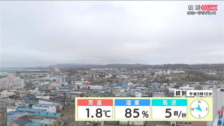 紋別ではどんより曇っていて午後5時頃の気温は1.8度です。あす22日(火)も厚手の上着が必要ですよ。