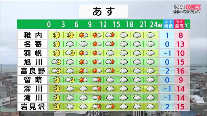 昼頃にかけて日差しがあるでしょう。最低気温は0度前後です。最高気温は稚内で8度とヒンヤリしますが、旭川と岩見沢は15度で暖かさが戻ります。