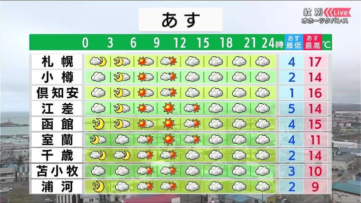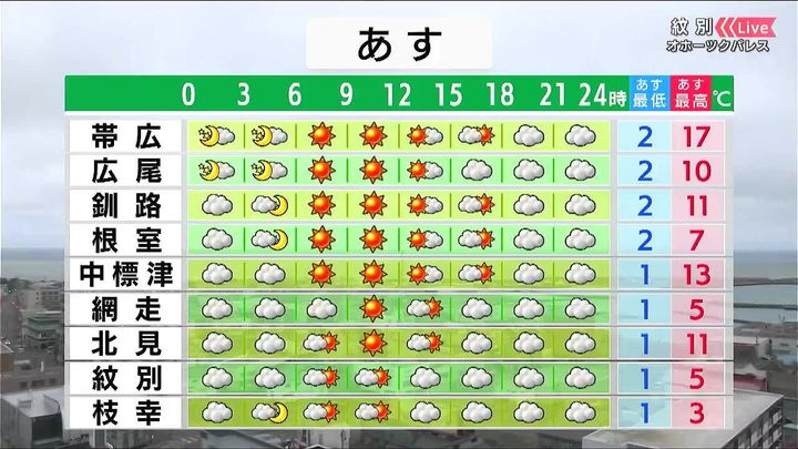 道東は朝から晴れて、あす22日(火)はにわか雨もないでしょう。オホーツク海側は多少日差しが戻りますが、海岸部は3月下旬並みの寒さです。