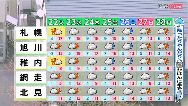 水曜は、札幌で曇り空に変わります。金曜、土曜は急な「にわか雨」に注意が必要です。稚内では最高気温が一ケタでヒンヤリする日が続くでしょう。