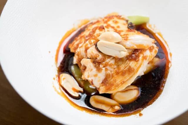 元麻布『一平飯店』や六本木『明寂』などミシュラン店をグループに持つ中国料理店『桃仙閣 東京』の四川料理「よだれ鶏」。しっかり感じる肉の旨味に加え、甘辛で酸味もあってパンチがあるのに日本酒の風味を邪魔しない絶妙の味付けです。