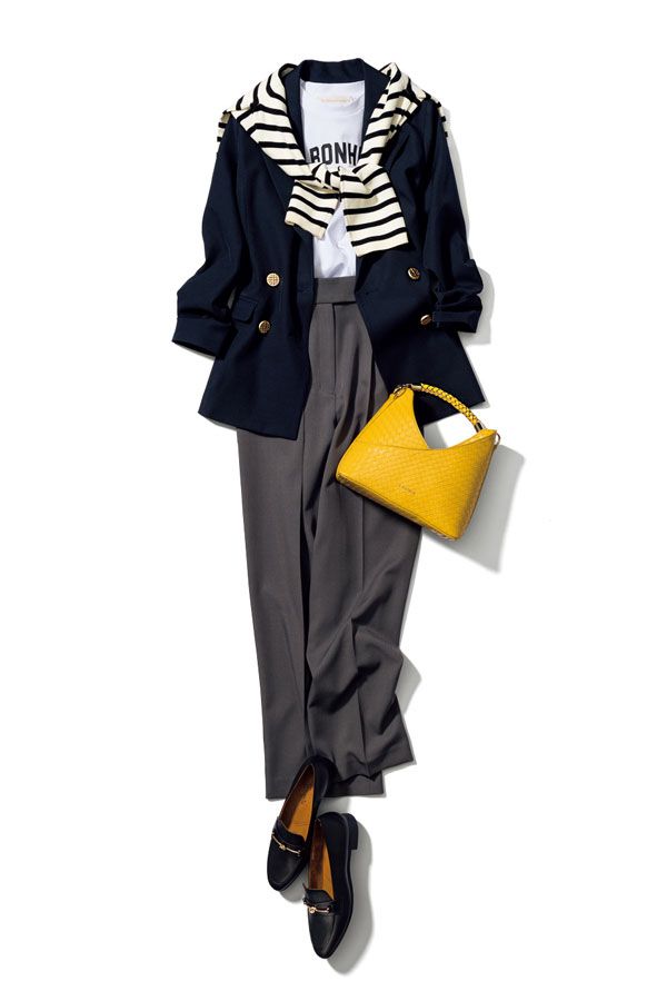 カーデをジャケットの上から巻いて、こなれた着こなしにアップデート。差し色でイエローを足してみると、より華やかなマリンスタイルに。
