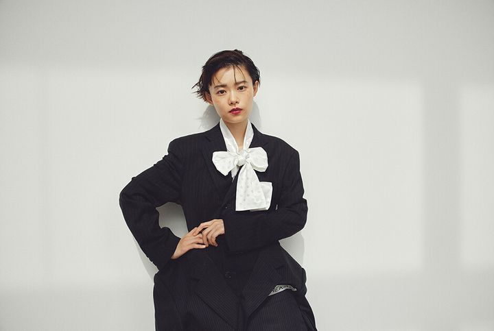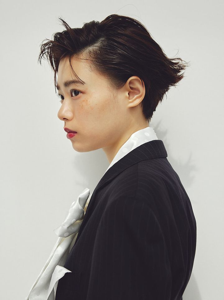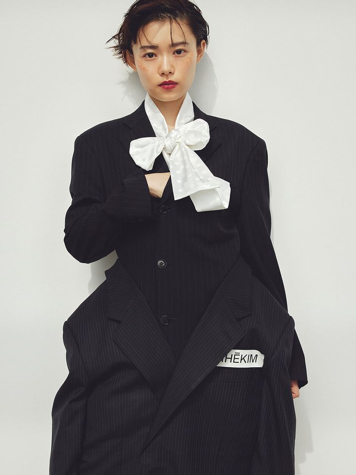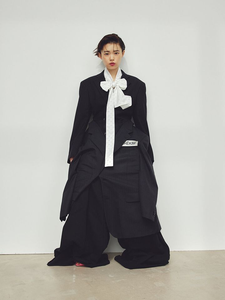 dress ¥554,700 by KIMHEKIM CARV STORE,blouse ¥89,100 by SHUSHU/TONG CARV STORE,trousers ¥24,200 by SHINYAKOZUKA THE WALL SHOWROOM,shoes stylist’s own