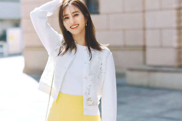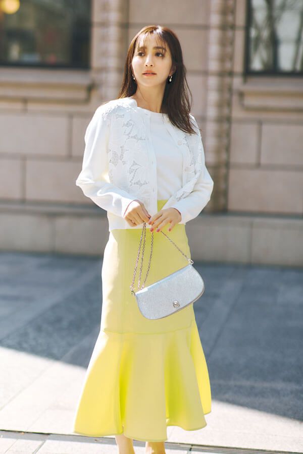 お仕事やかしこまった場でも通用する品のよさがあり、かつ女性らしい柔らかさも♡ カーデの花柄レースの透け感もレディな白アンサンブルの清潔感で、イエローのスカートが派手に映らず上品。きちんと感あるコーデに。