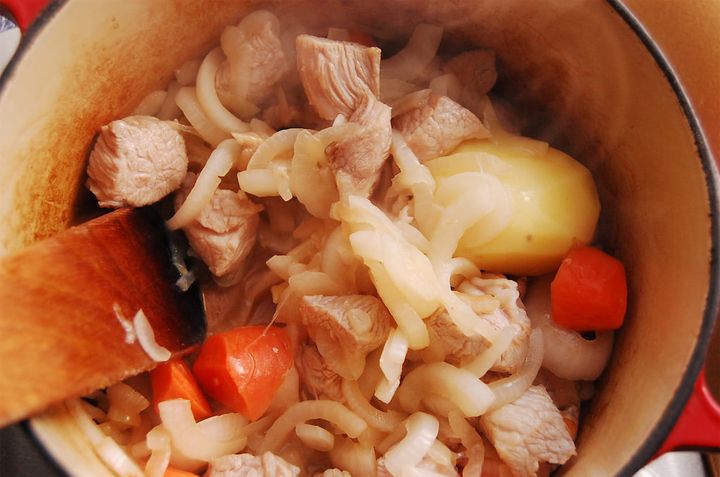 肉と野菜を油で炒めた後、750mlの水を注ぎ、フタをせずに中火で加熱。沸騰したら、弱火~中火で約20分煮込みます。