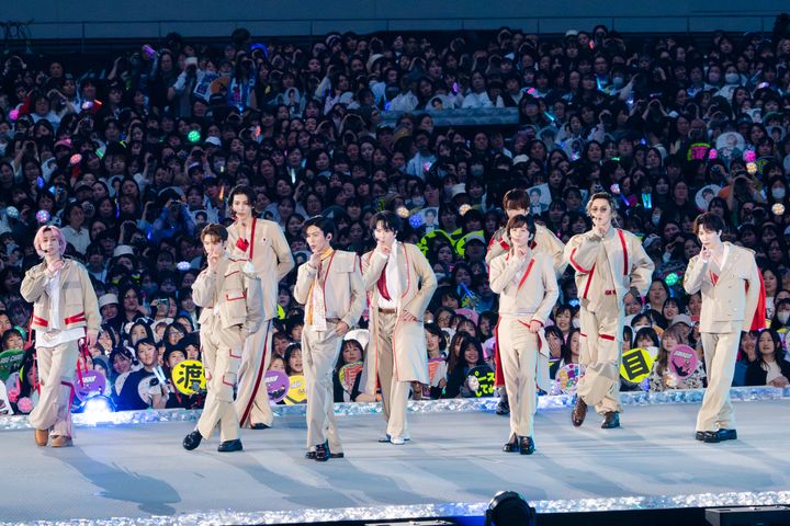 そして、目黒さんが「次の曲はファンの皆さん、伝えたい言葉を並べた曲で、僕たちのそういった思いが皆さんに歌を通して届けばいいなというふうに思います」と曲振りをしてから「Dear,」へ。ファンへの愛が込められた曲をメンカラに輝くゴンドラに乗って心をひとつにして歌うメンバーたち。この瞬間、佐久間さんは「夢に見た景色だなと思って、感極まって号泣した」と公演後の会見で語っていたが、スタジアムライブは9人にとってずっと夢に見た光景に辿り着いた瞬間。9分割のスクリーンに一人ひとり映し出される表情は、皆、目をキラキラと輝かせ、感慨深げ。「皆、ありがとう」(岩本さん)とステージ去り際、それぞれが感謝の想いを届けて、夢の時間が幕を閉じた。