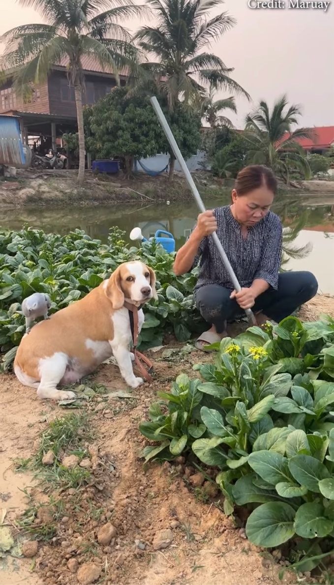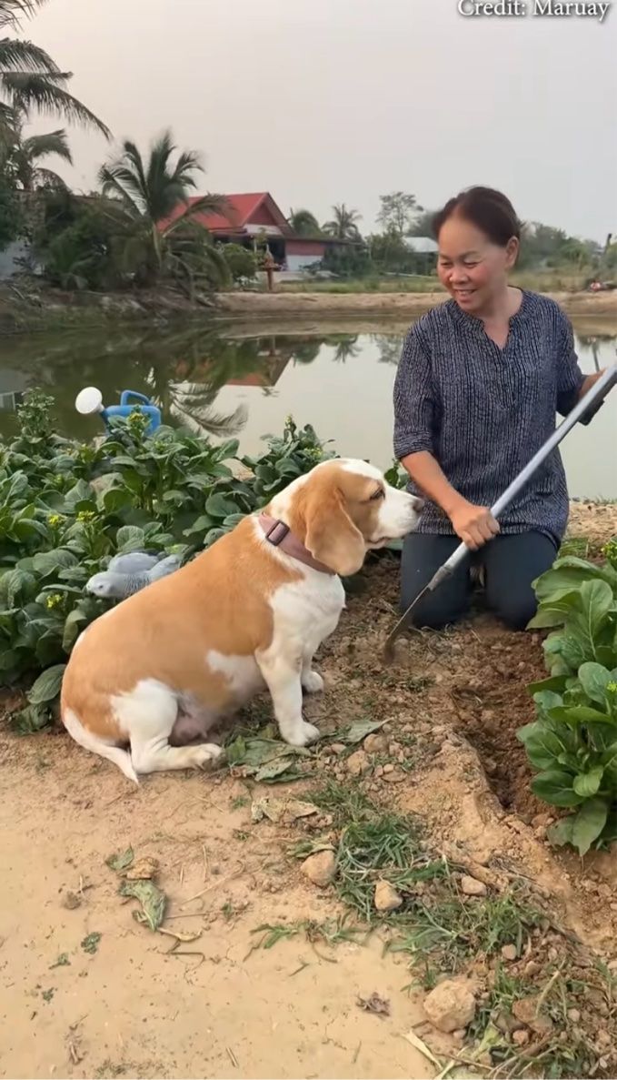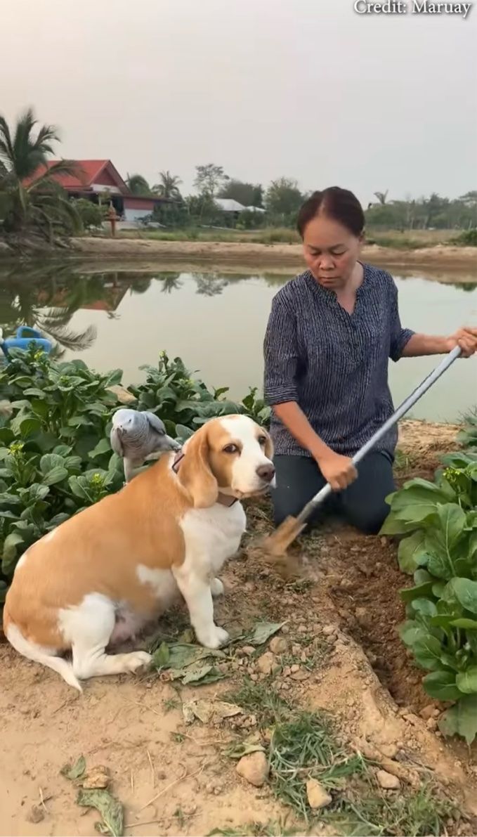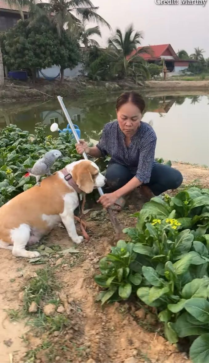農作業を行う女性の隣に腰を下ろしているビーグル犬。 その背中には、ヨウム(アフリカン・グレー・パロット)が乗っているのが確認できます。