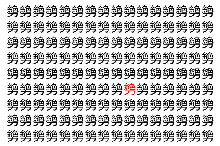 画像の中には、「㔢」という漢字が縦に9行、横に16個並んでいます。 全部で144個となりますが・・・、そのうち1つは「異なる漢字」となってますよ!!