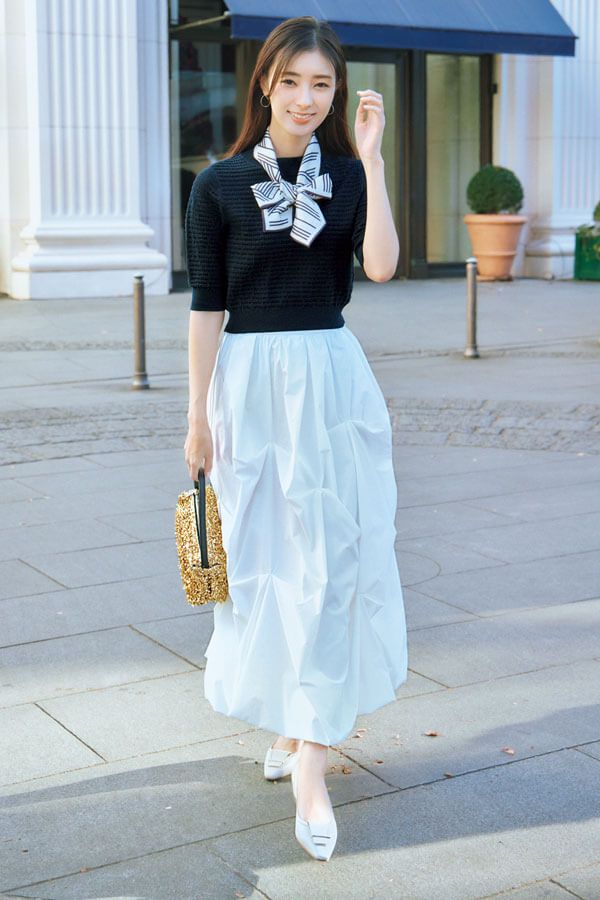 タックで立体感をつけたバルーンスカートで、ホワイトがより優しげな印象。×ネイビーの配色は、清潔感も抜群です。