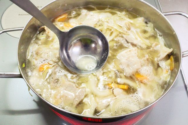 8分ほど加熱するとアクが少し出てきたので、取り除きました。