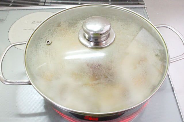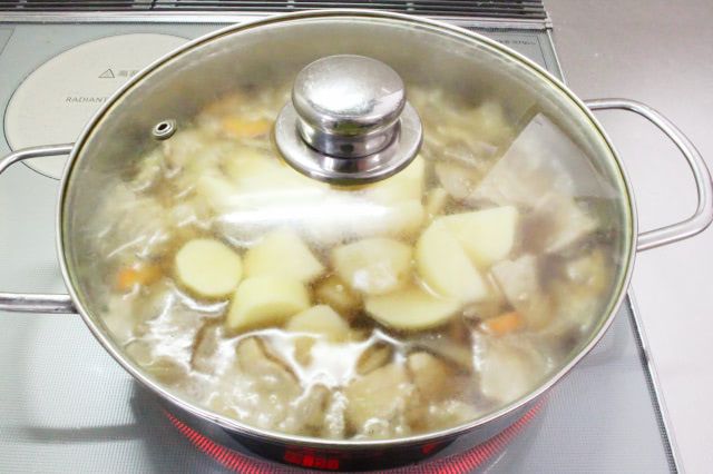 じゃがいもを加えてフタをし、弱めの中火で13分ほど煮込みました。