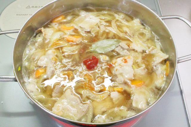 今回は米粉、カレー粉、水、しょうゆを混ぜたものを最後に加えますが、味に深みが出るよう、コンソメ、ケチャップ、ウスターソースを加え、香りがよくなるようにローリエも加えます。