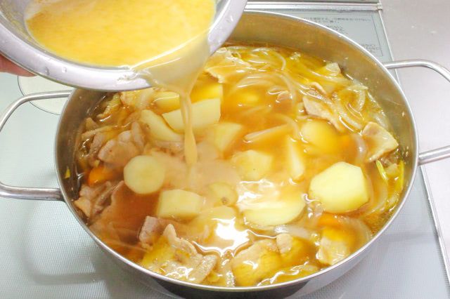 6. ローリエとアクを取り除いて火を止め、米粉、カレー粉、水、しょうゆをよく混ぜたものを加えます。