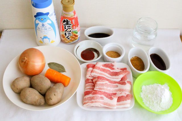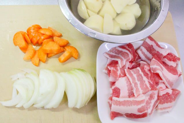 1. 玉ねぎを繊維に沿って3mm幅の薄切りに。にんじんは、3~5mm幅の半月切りにします。じゃがいもはひと口サイズに切って水に晒し、豚肉は食べやすい長さに切ります。