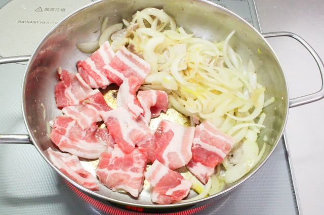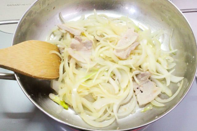 残りの豚肉を加え、横によけた玉ねぎが焦げないように混ぜながら、豚肉を2分ほど炒めました。