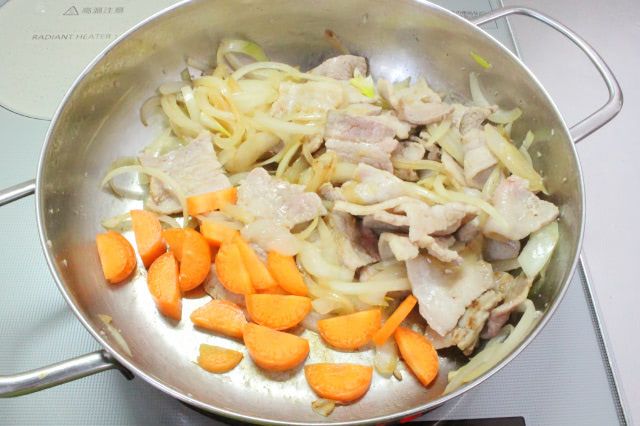 3. 残りの豚肉を加えて、色が変わる程度に炒めます。にんにくとにんじんも加えてサッと炒めたら、水を加えて煮立たせます。