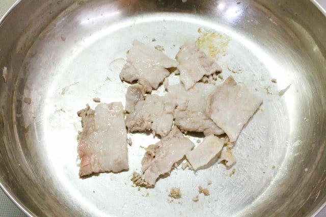 弱火で2分ほど炒めると、豚肉の色が変わりました。このレシピでは、少量の豚肉を先に炒めて油を引き出します。すると、余分な油を使わなくても、野菜を炒められるというわけです。