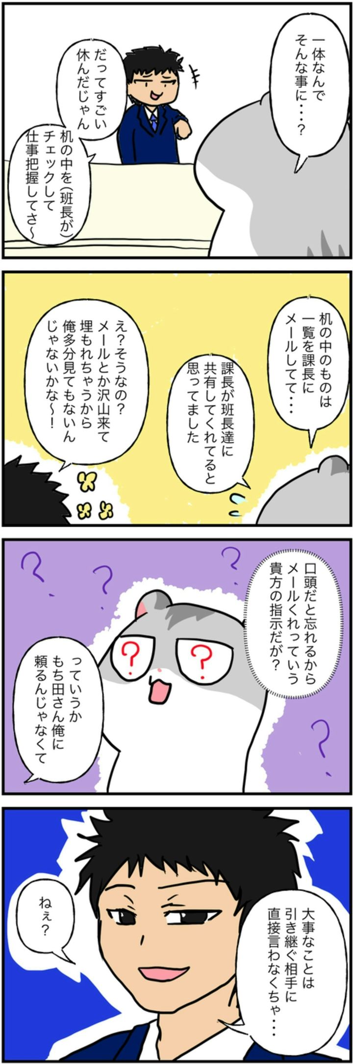 指示に従い、ハム子さんは引き継ぎ業務を課長にメールで送っていました。ところが、平然と「見てない」と言い放ちます。さらに、「大事なことは引き継ぐ相手に直接言わなくちゃ」と言います。まるで、ハム子さんに全て非があるかのような言い方に、とても混乱してしまいますよね。