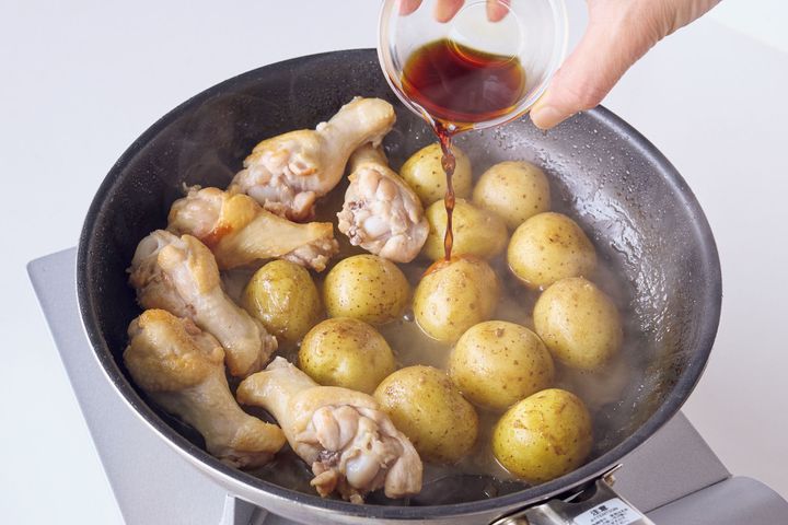 フライパンにサラダ油大さじ1/2を中火で熱し、手羽元を並べる。面を変えながら焼きつけ、全体に焼き色がついたら、じゃがいもを加えて炒める。油が回ったらだし汁、酒、みりん各大さじ1を加え、落としぶた※をして弱めの中火で10分煮る。しょうゆ大さじ1を加えて中火にし、混ぜながら汁けをとばす。